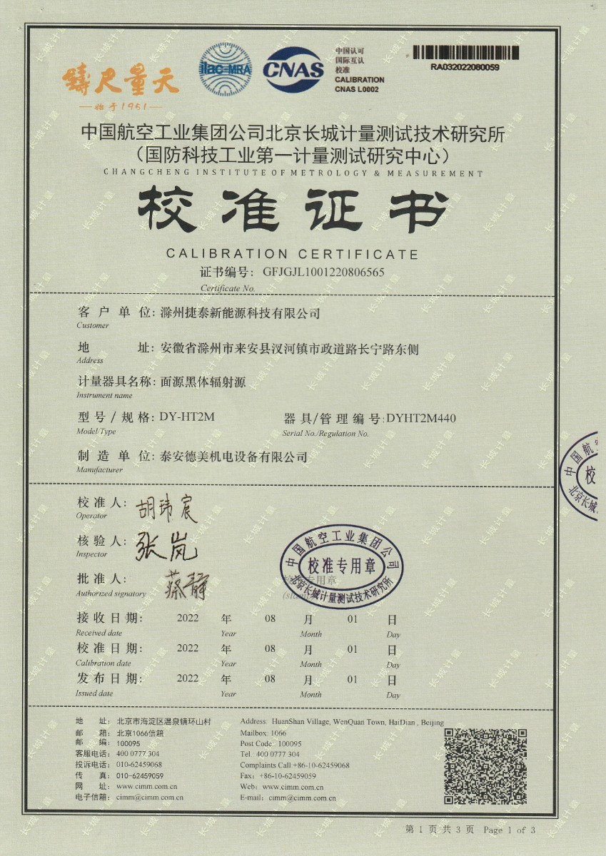 滁州捷泰新能源科技有限公司-面源黑體爐 2022-8-17 本文被閱讀 14472 次