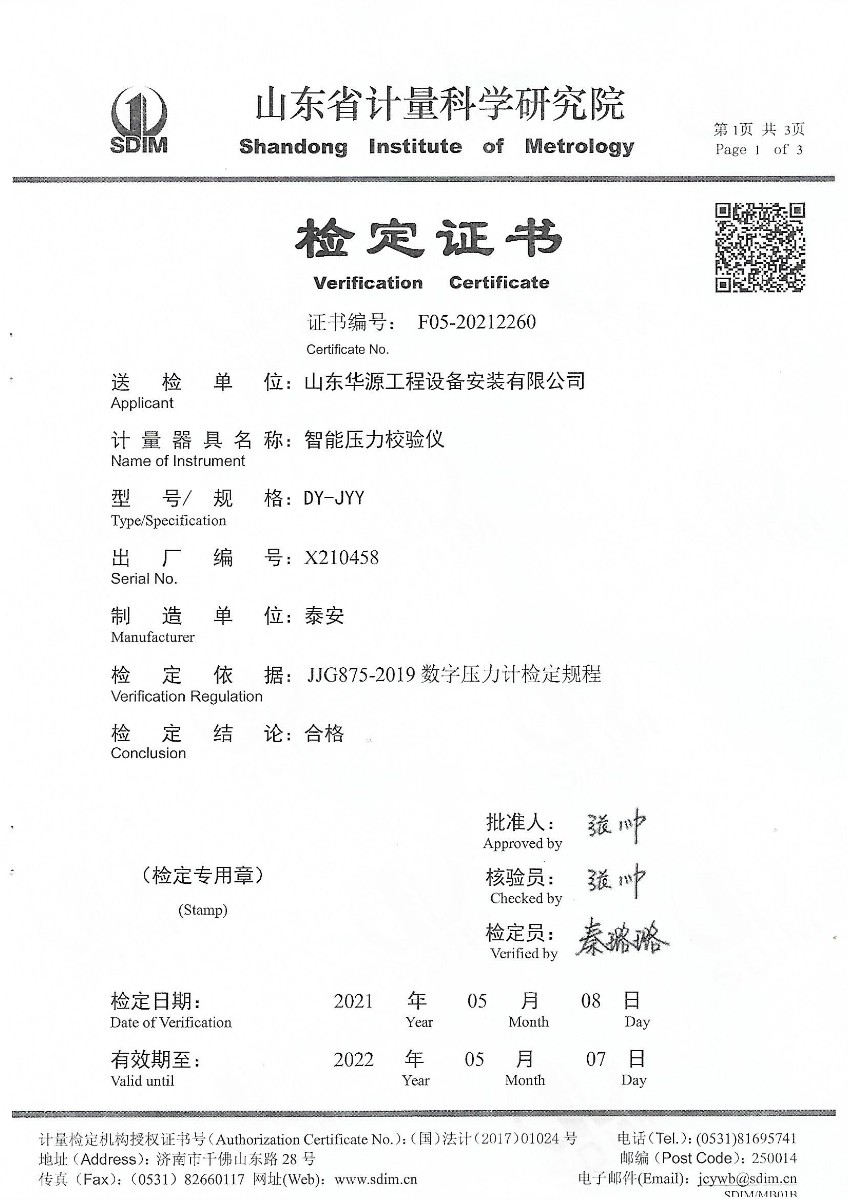 | 上一條:山東華源工程設(shè)備安裝有限公司-智能壓力校驗儀X210457 | 下一條:冷鏡式露點儀校準(zhǔn)證書 |