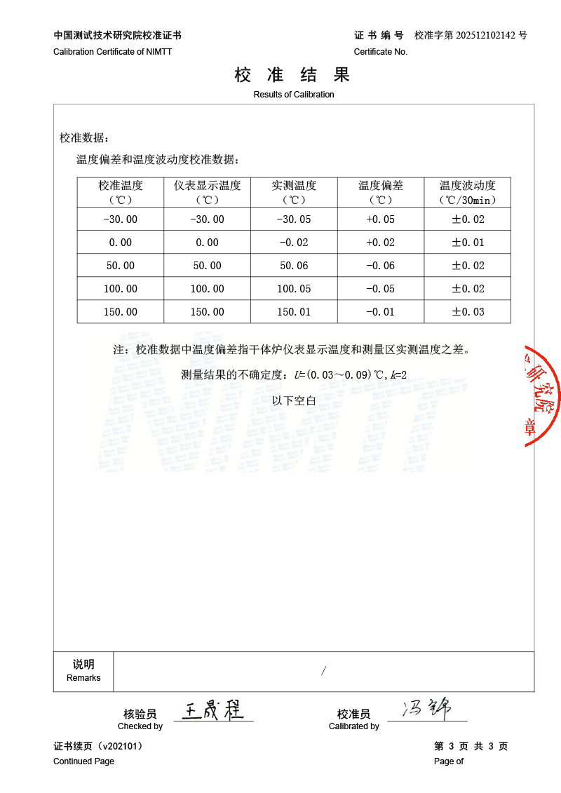 低溫干體爐校準(zhǔn)證書